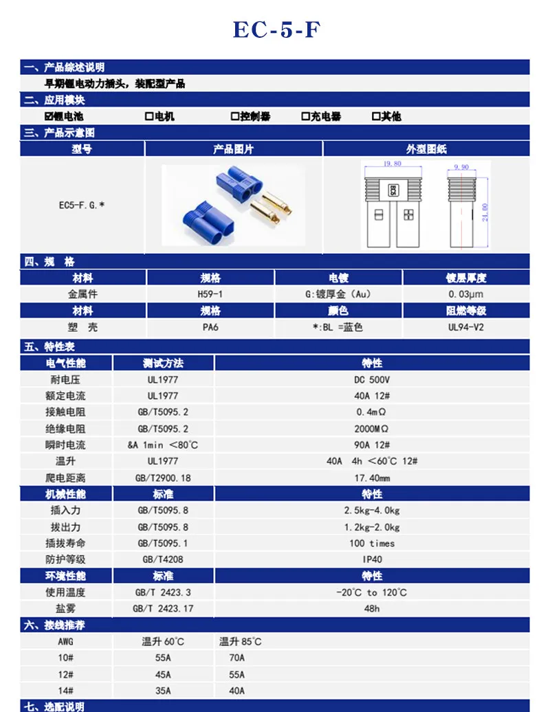EC5 drone plug with cable motor battery pack high-current connector charging port, copper plated gold male and female connectors